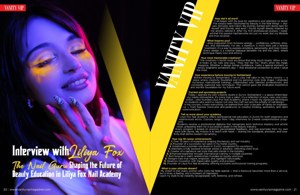 Today, I operate my own creative studio in Zurich, Switzerland — a space where beauty meets atmosphere. It’s more than a salon; it’s a reflection of style, care, and connection. I also founded Liliya Fox Nail Academy, where I teach my signature techniques to students who want to master not only the craft but also the artistry of nail design.
